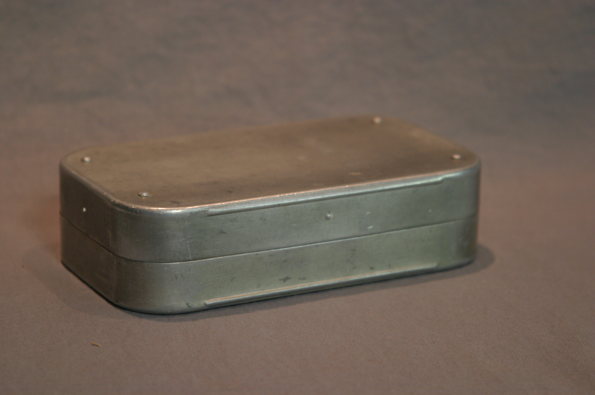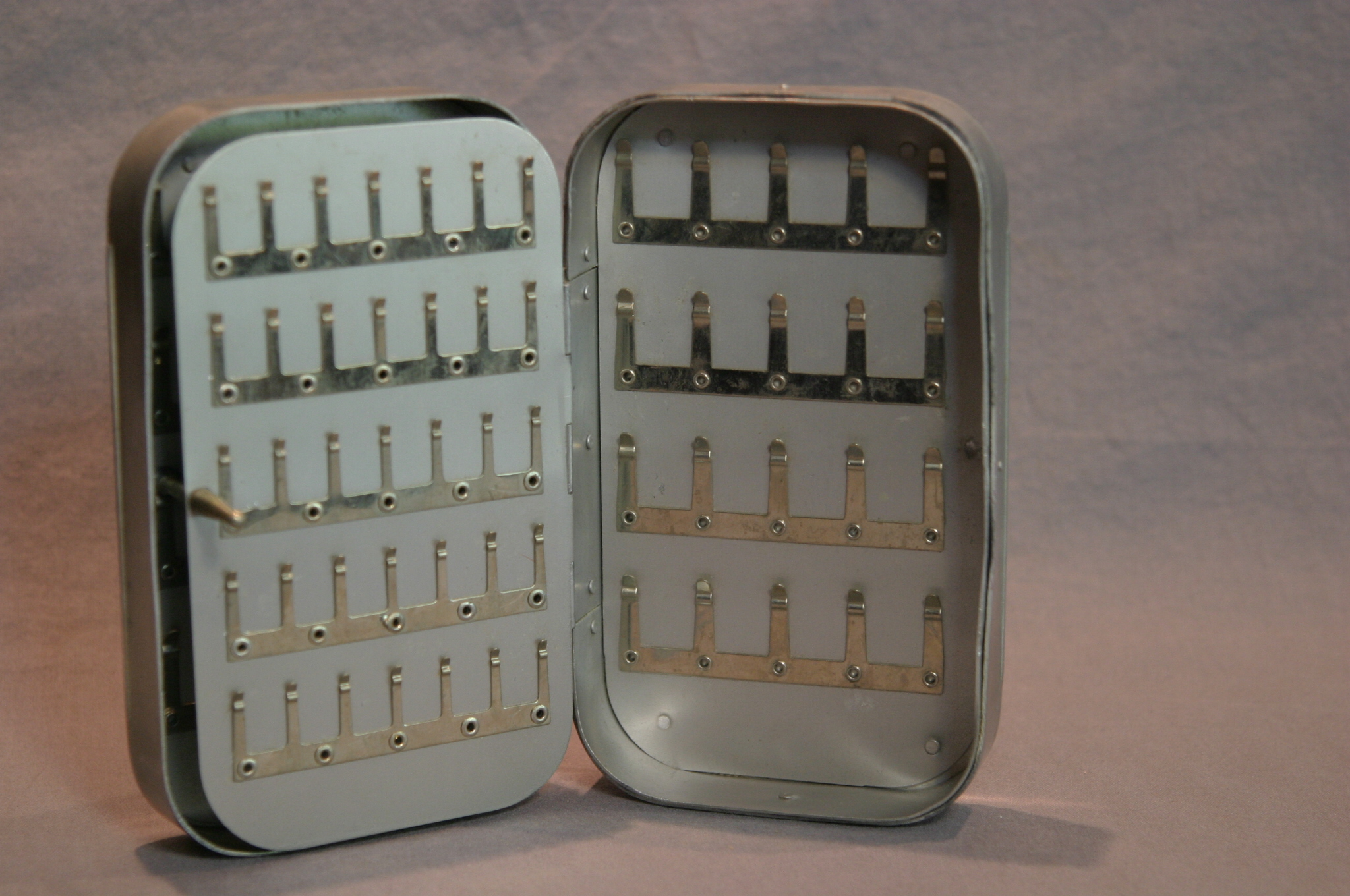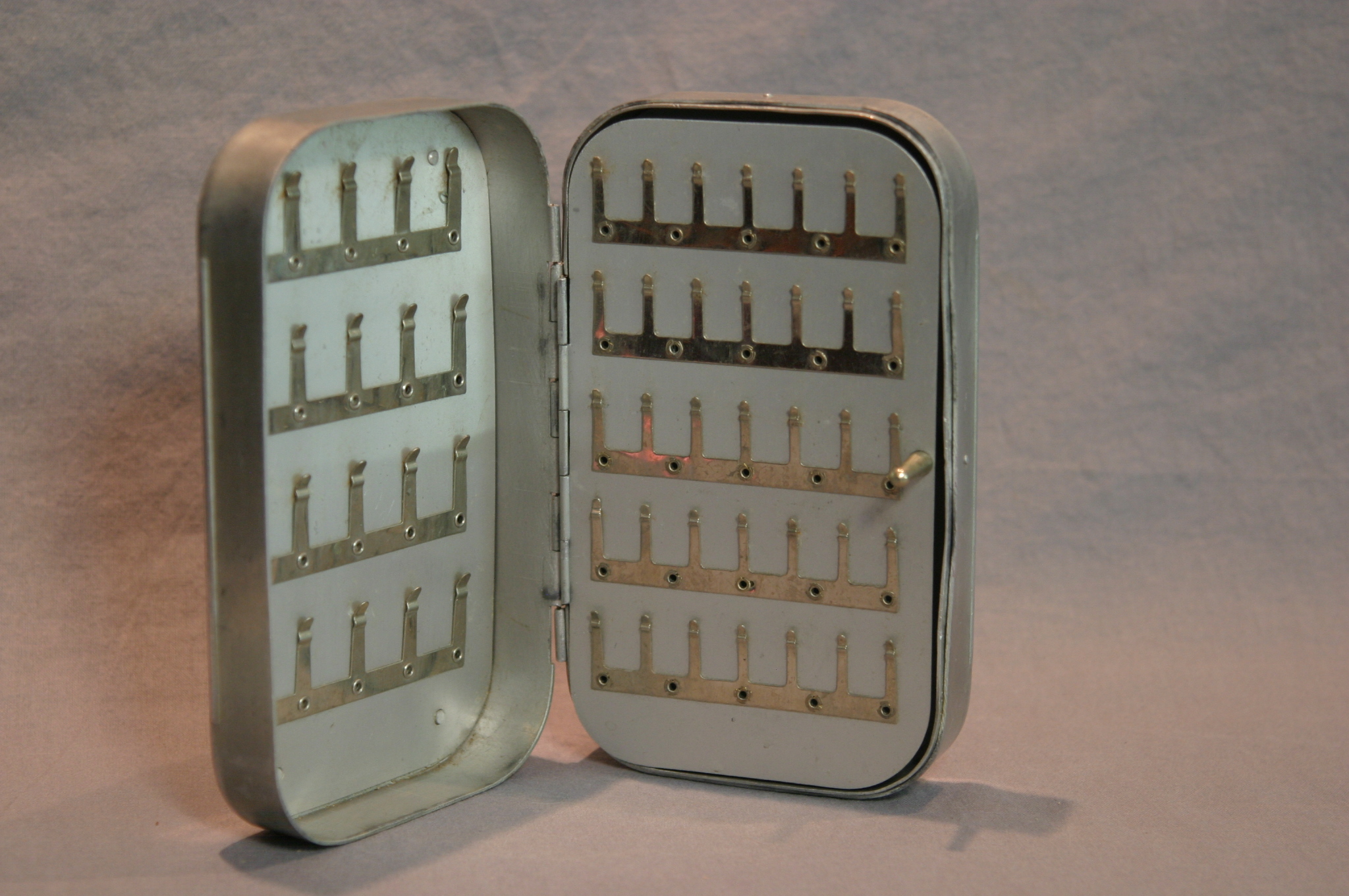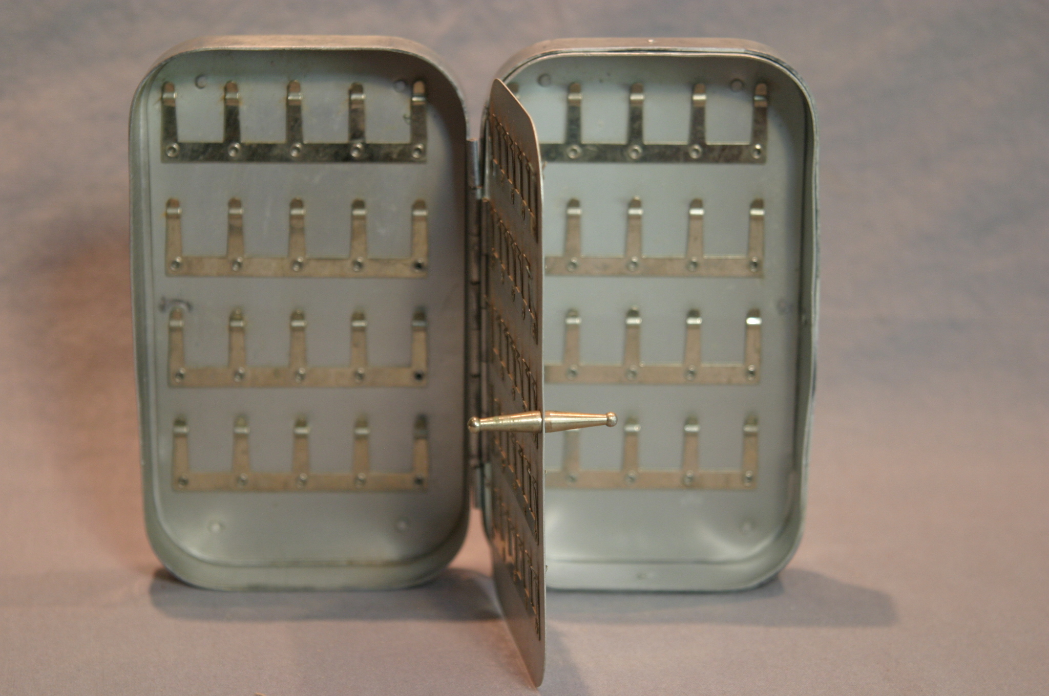 A Wheatley Silmalloy Metal fly box in nice condition! The box is two sided with a divider in the middle, there are four walls of silver fly clips.