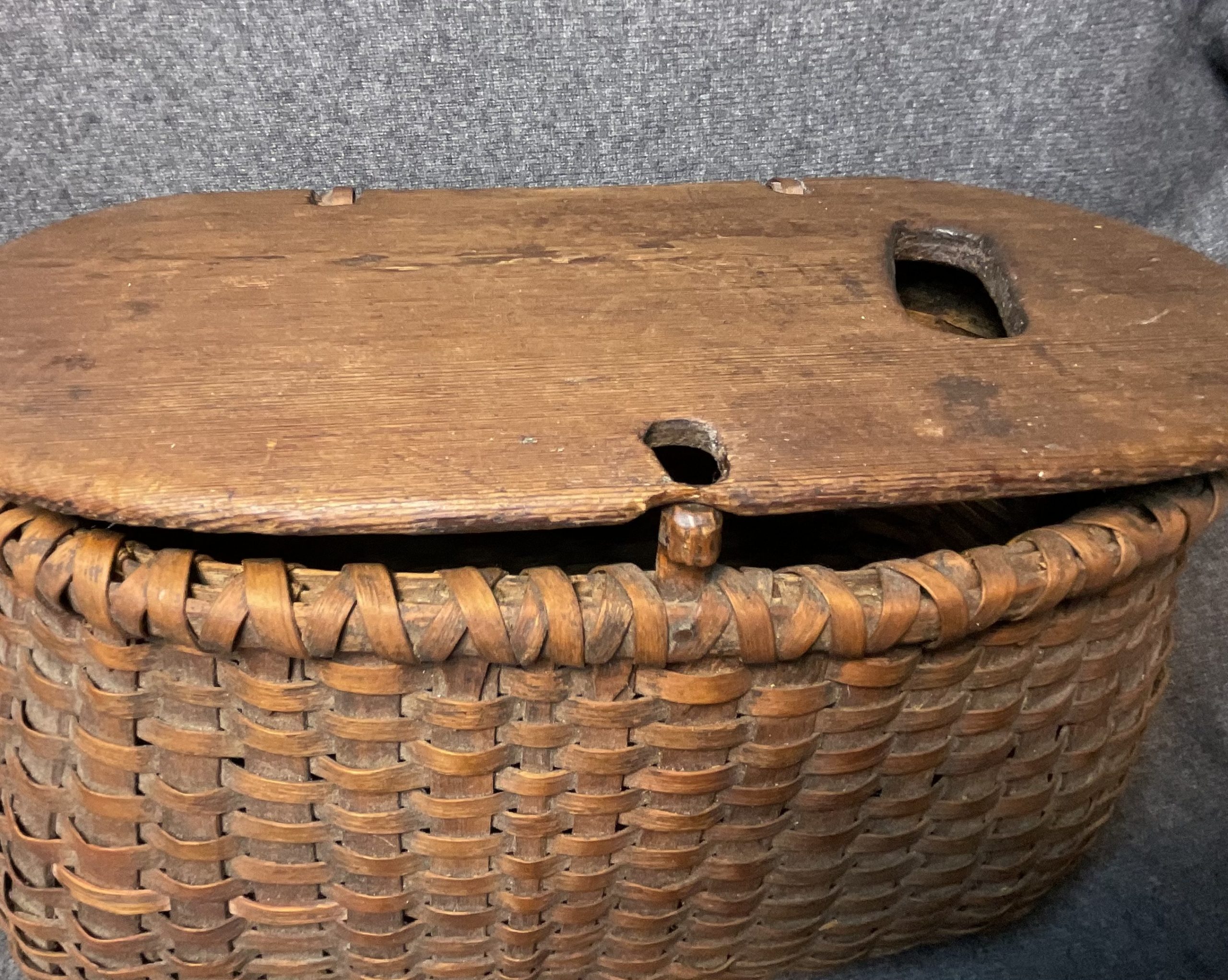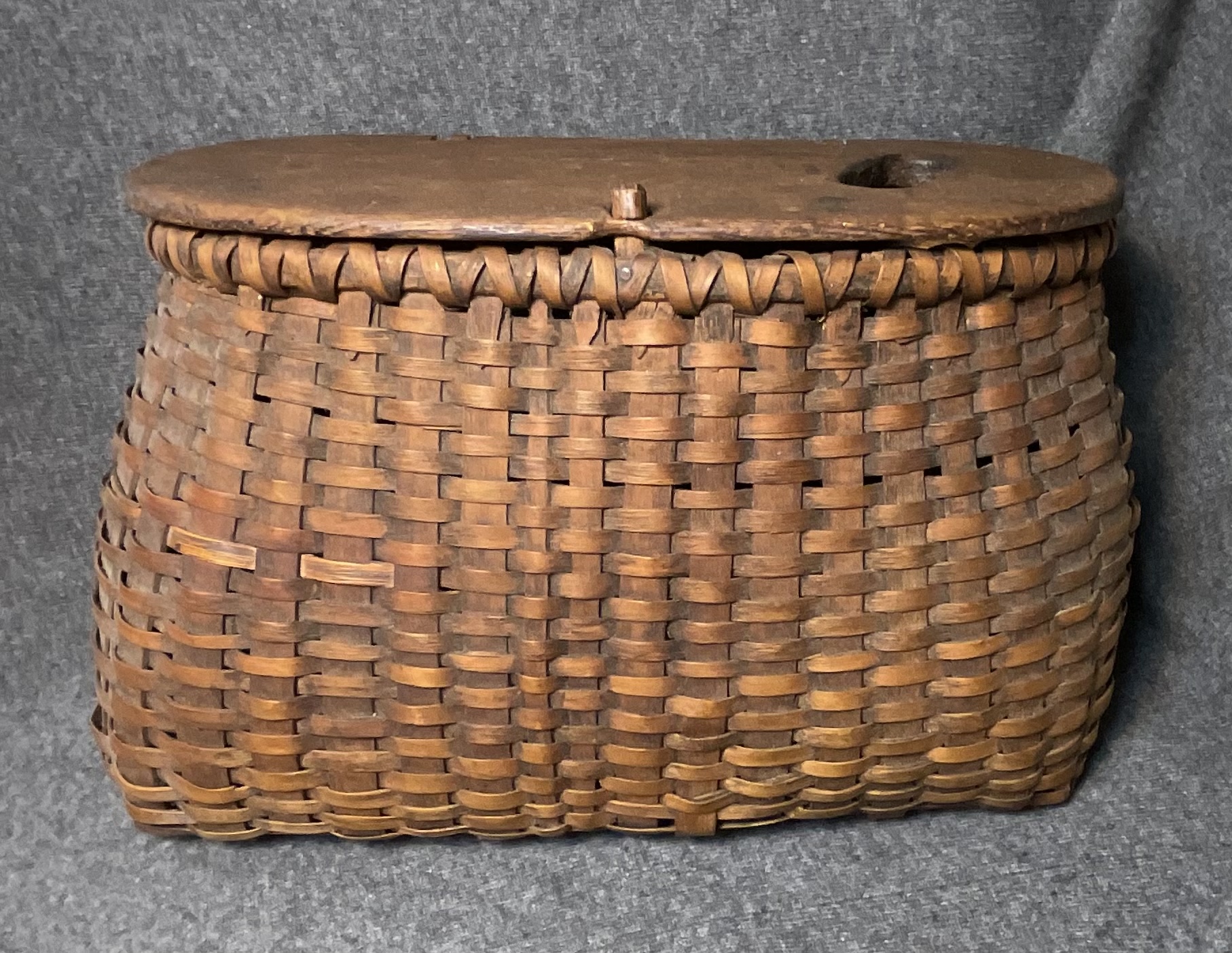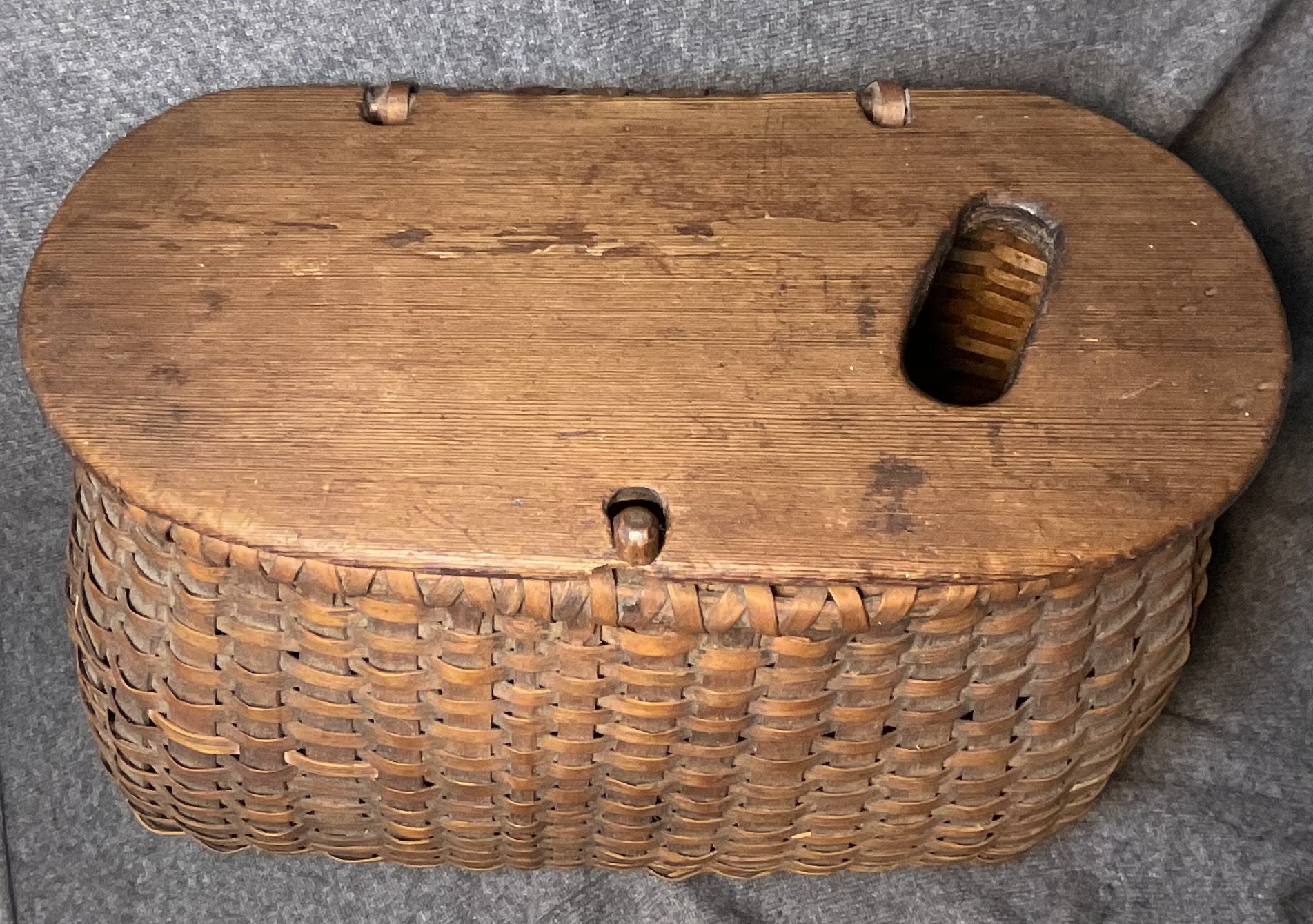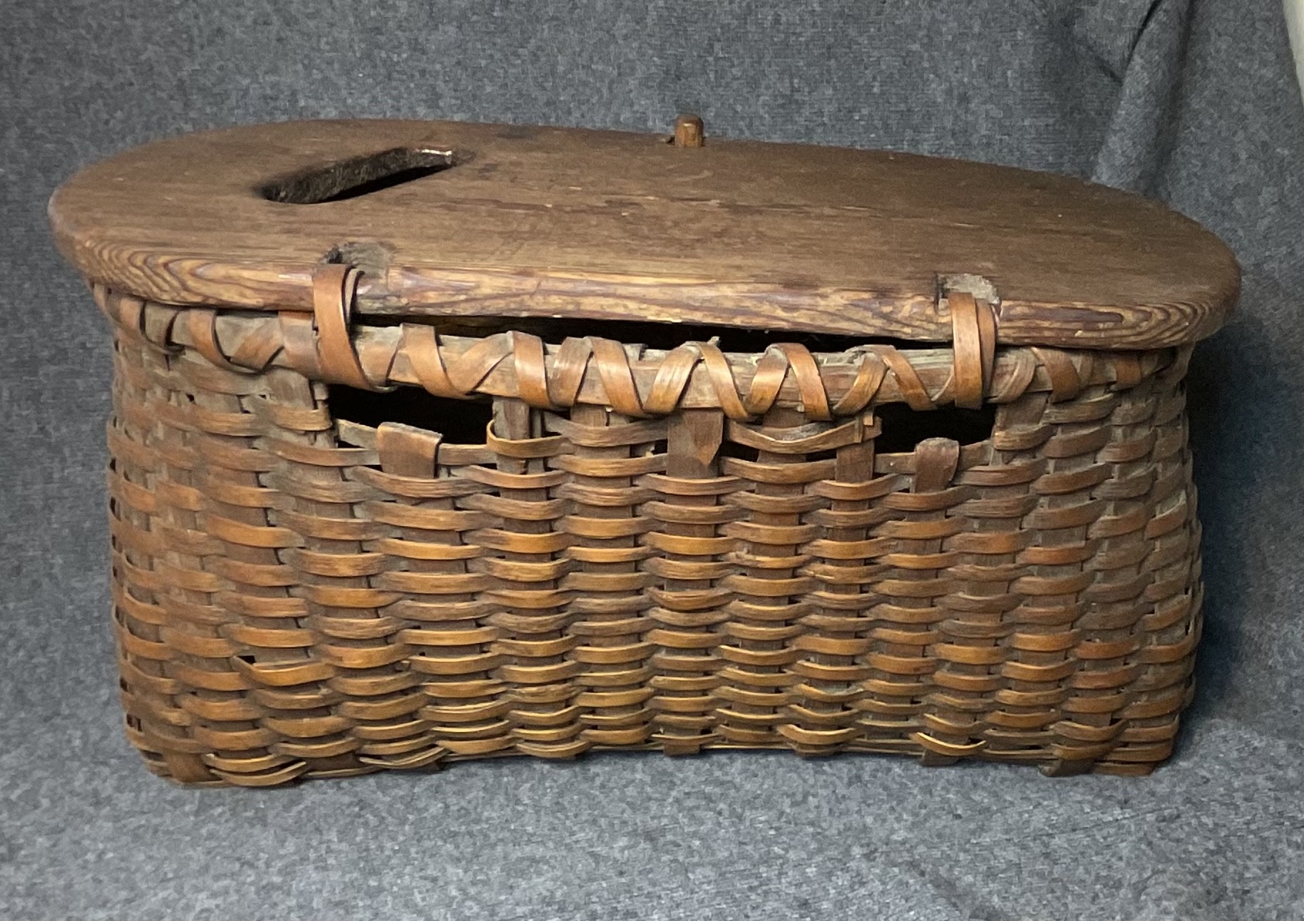 This creel is made from split ash bark, a Woodlands creel made by Chippewa. The creel has a 3/8” wood top with a left hand hole and wooden latch. The creel is in very nice condition.