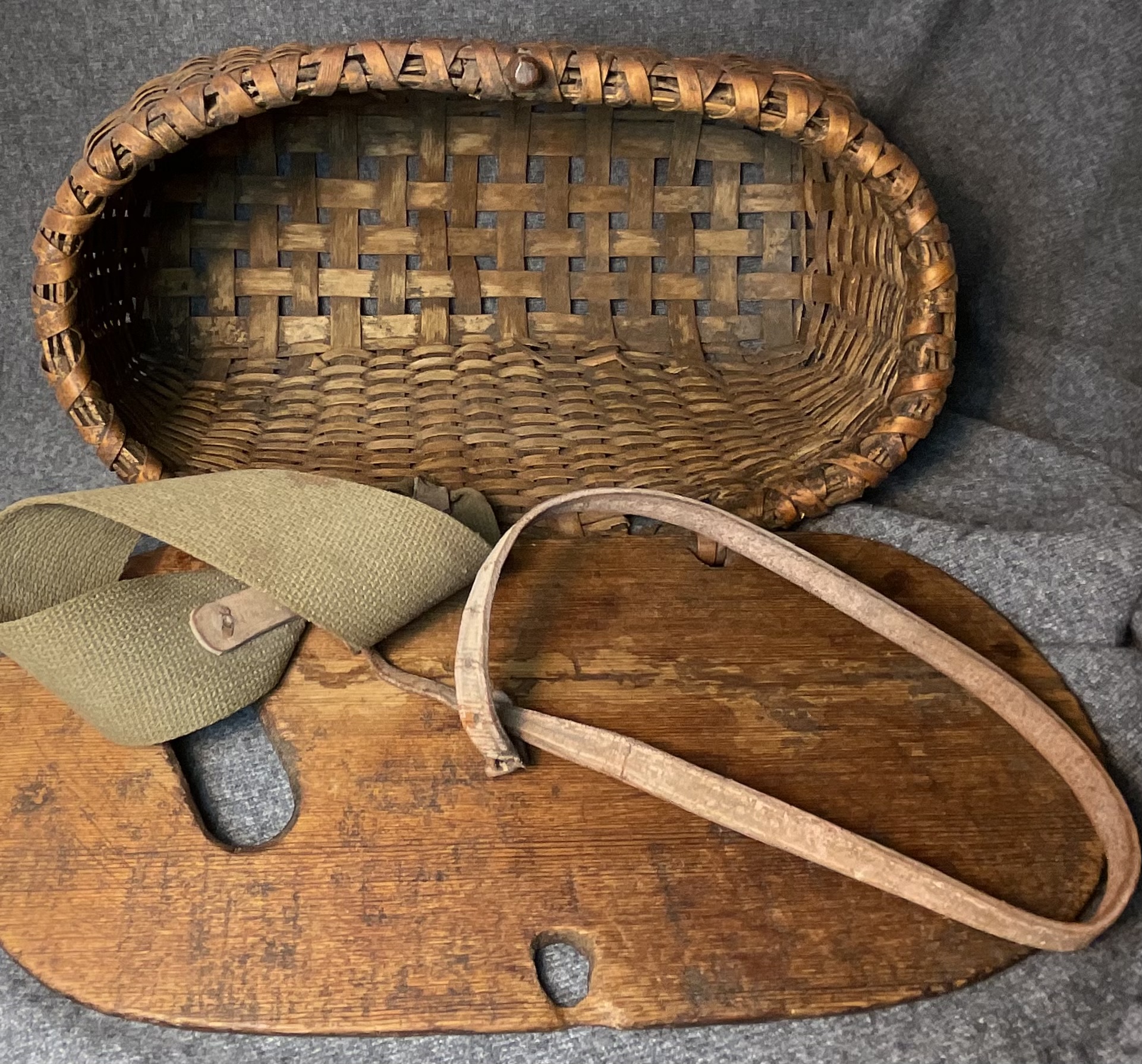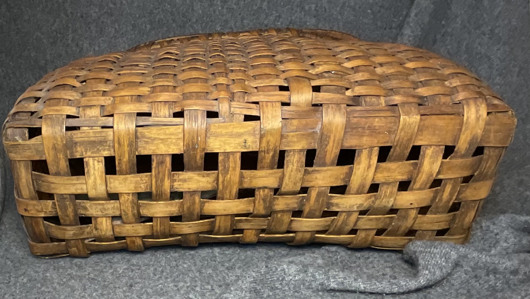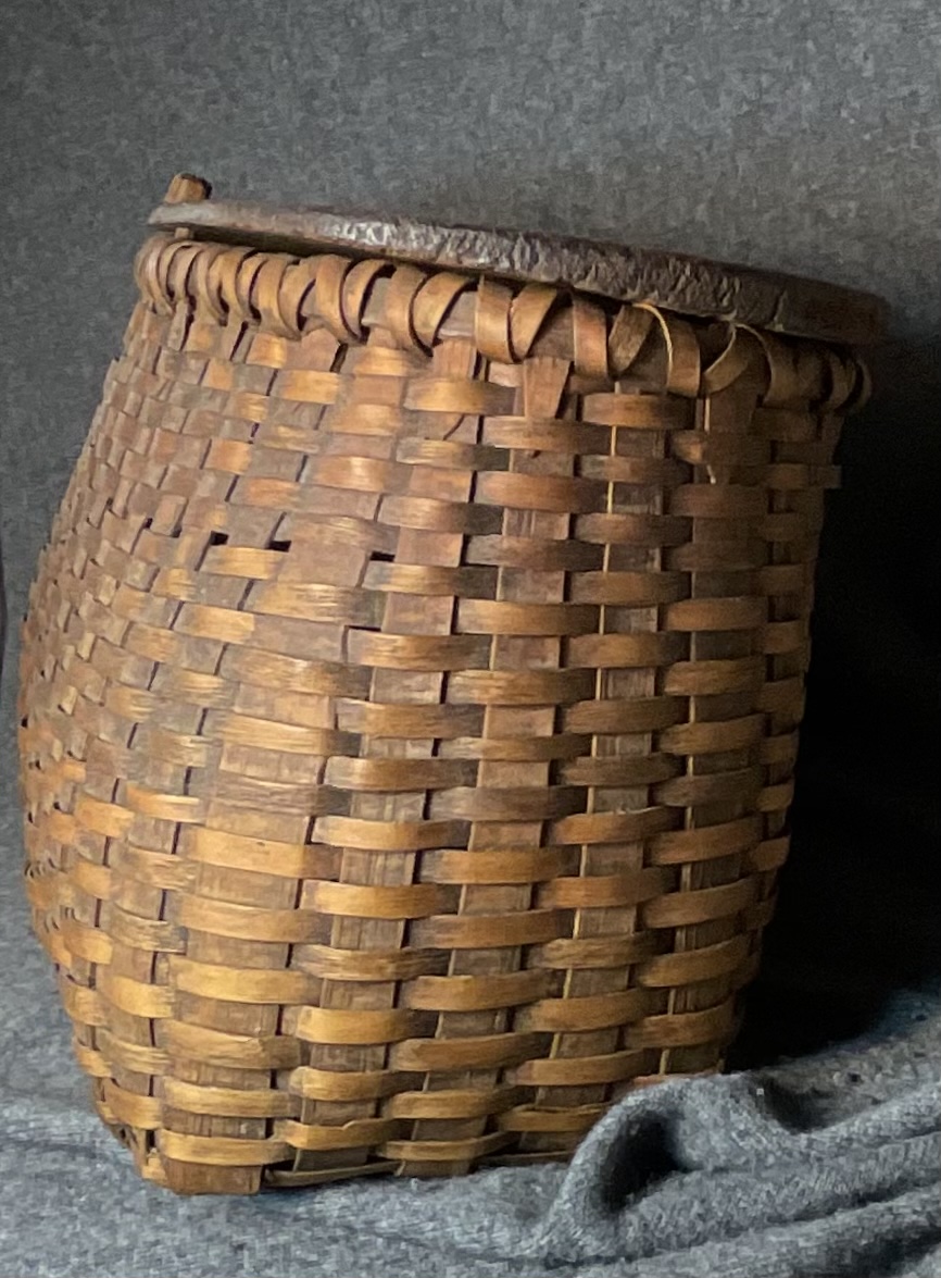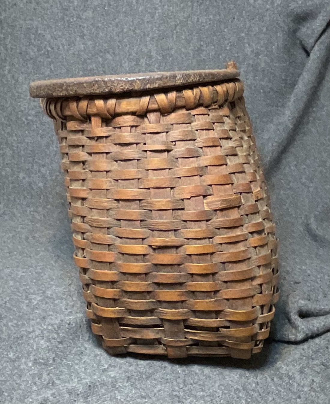 This creel is made from split ash bark, a Woodlands creel made by Chippewa. The creel has a 3/8” wood top with a left hand hole and wooden latch. The creel is in very nice condition.